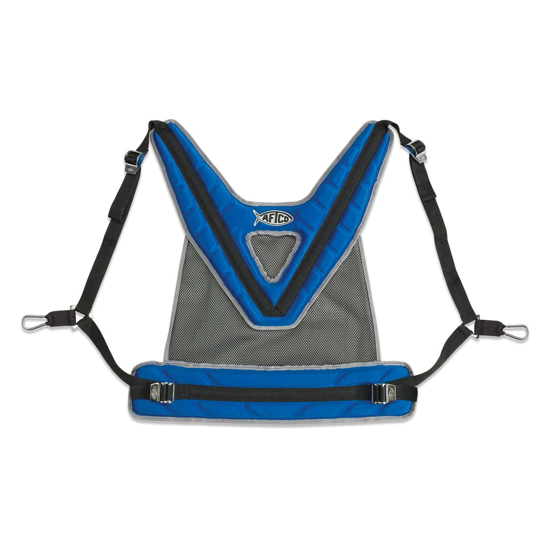 The AFTCO Shoulder Harness is the perfect choice for stand-up battles when using lighter tackle applications up to and including 50-lb. test line. The lycra® polyester covered bio-foam shoulder and back-band padding (with synthetic terry cloth liners) connected with ventilated mesh distribute the load comfortably across the back of the angler, and allow the shoulders and upper body to carry the load during extended light to medium-tackle fights with stubborn gamefish. The four stainless steel ladder-locks are easily adjustable for the perfect fit, even when under load, and the stainess steel carabiner clips provide a secure attachment to reel harness lugs. All of the nylon webbing straps are cross and box-stitched at the critical locations for extreme durability. Included is a mesh bag with grommets for rinsing the fishing shoulder harness with fresh water and for easy storage. Otherwise, the AFTCO Shoulder Harness is completely synthetic and machine washable. One size fits most.