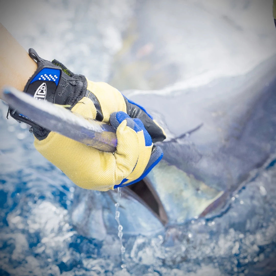 AFTCO Wire Max salt water fishing gloves were designed using the expertise of Capt. Peter B. Wright, world famous big game skipper, author, and IGFA Hall of Fame member. This is the ultimate saltwater fishing glove for leadering big fish. Closed cell EVA foam covered with super tough Armortex® wraps hand and lines palm, fingers and thumb to maximize protection when handling mono, wire or cable leaders. Durable Tacky-Grip palm and Spandura® fourchettes improves dexterity, while foam-backed mesh keeps fingers cool and protected. Wrap-around neoprene strap with Velcro® closure over woven cuff assures a secure fit and repels leader snags.