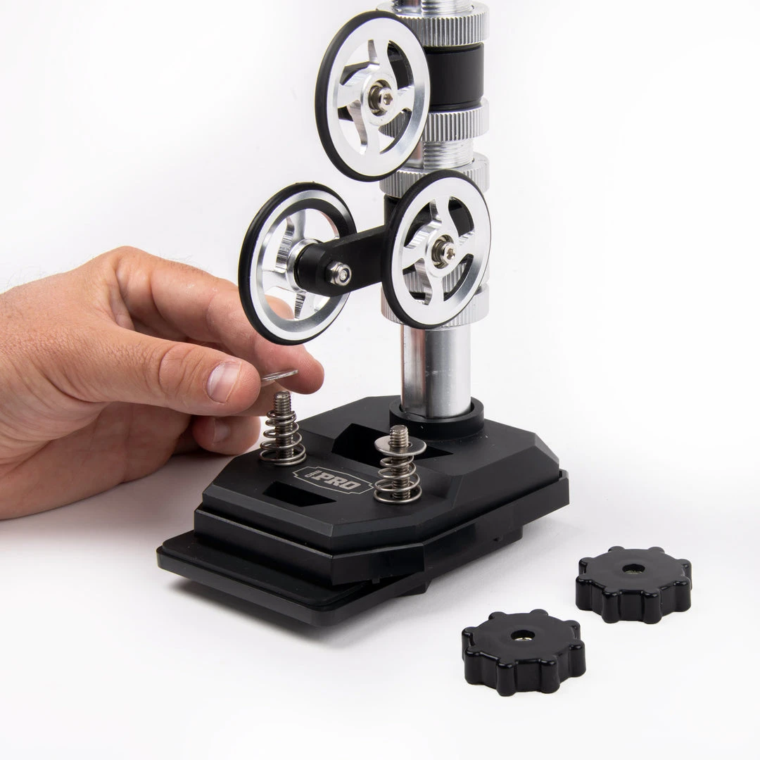 This plate is made from Durable ABS plastic to withstand any professional application. An integrated rubber gasket provides a steady hold while the spring loaded plate allows for ultimate mobility. A bolt set is included and the Adapter Plate comes assembled and ready to integrate your CRB PRO Roller Stand to the C-Channel tracks systems, including American Tackle, Pac-Bay and others.