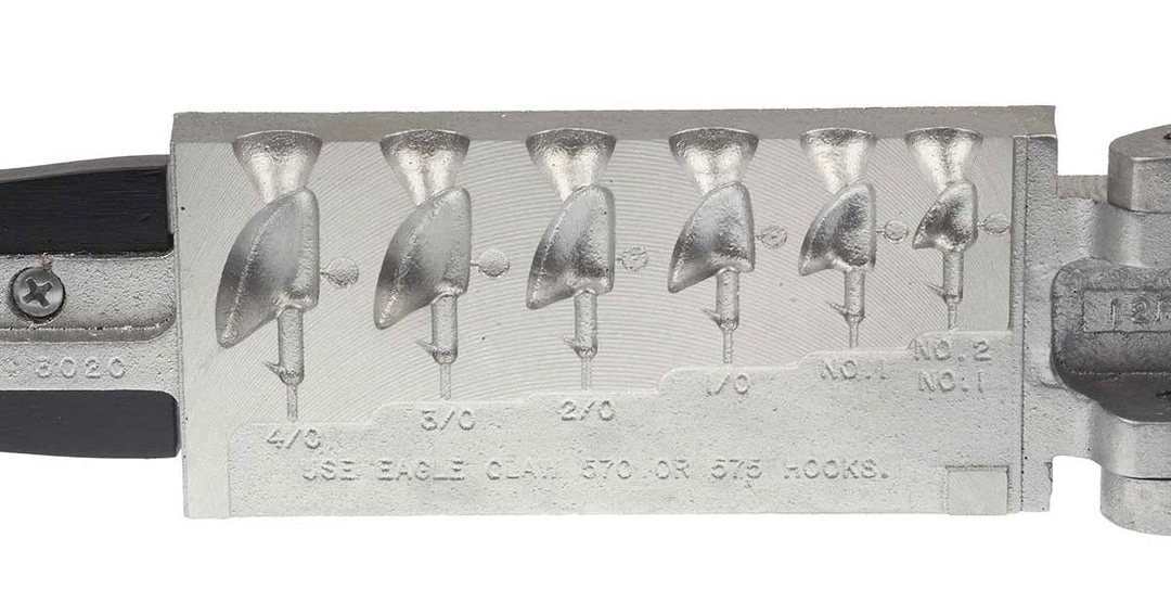 DO-IT mold model EHB-6-A features 6 cavities in sizes 1/8 – 1/4 – 3/8 – 1/2 – 5/8 – 3/4. See table for hook size requirements.