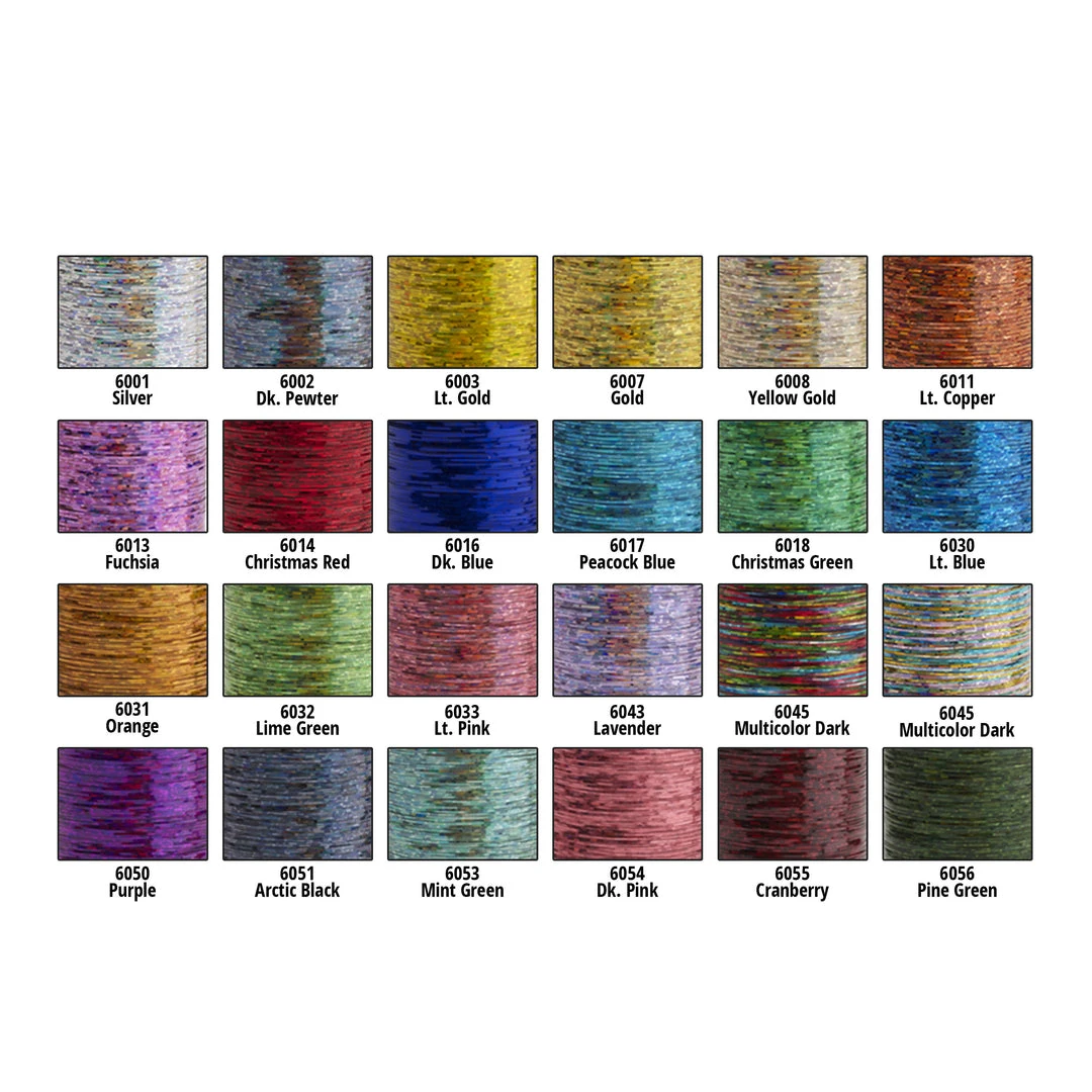 | Color | 6001 Silver, 6002 Dk. Pewter, 6003 Lt. Gold, 6007 Gold, 6008 Yellow Gold, 6011 Lt. Copper, 6013 Fuchsia, 6014 Christmas Red, 6016 Dk. Blue, 6017 Peacock Blue, 6018 Christmas Green, 6030 Lt. Blue, 6031 Orange, 6032 Lime Green, 6033 Lt. Pink, 6043 Lavender, 6045 Multicolor Dark, 6046 Multicolor Light, 6050 Purple, 6051 Arctic Black, 6053 Mint Green, 6054 Dk. Pink, 6055 Cranberry, 6056 Pine Green |