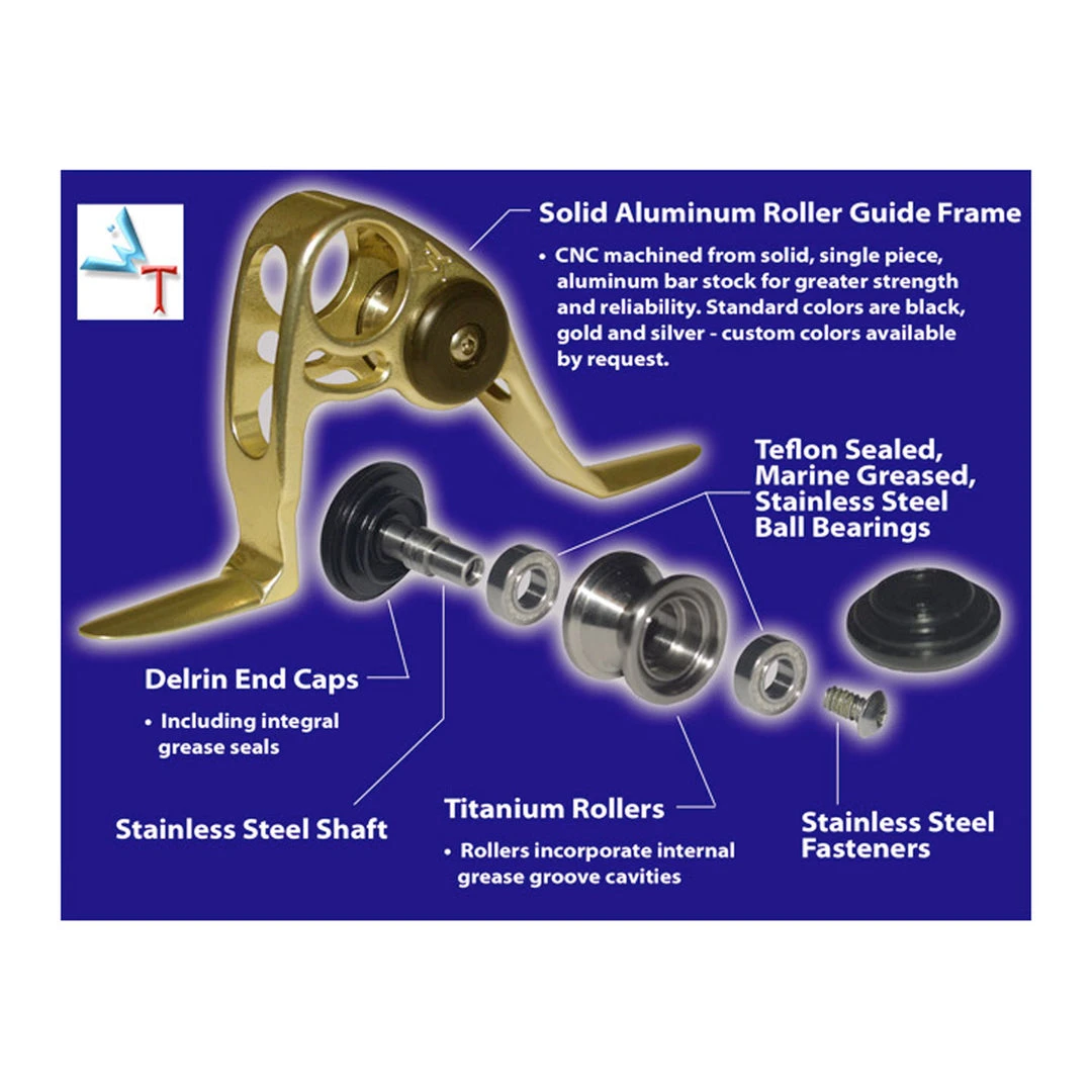 - Every roller guide incorporates titanium rollers riding on two stainless steel, teflon sealed ball bearings. The bearings are marine greased and protected from the elements with delrin end caps including grease seals.